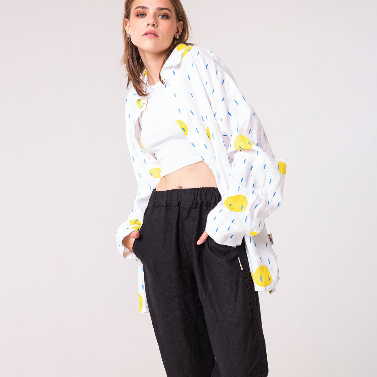 A perfect pair of black linen trousers with a waistband and pockets! Perfectly match with the sun after rain or a greenish shirt.